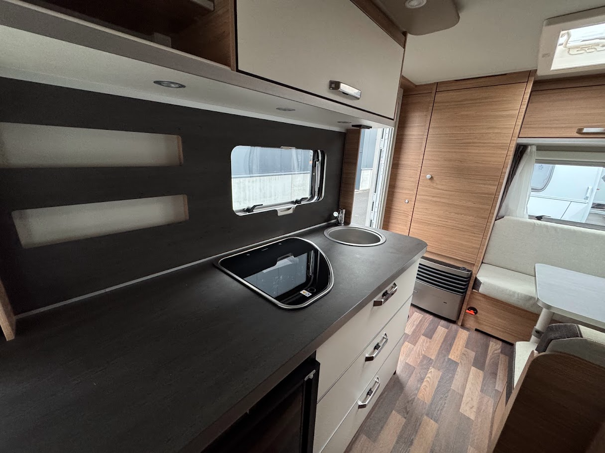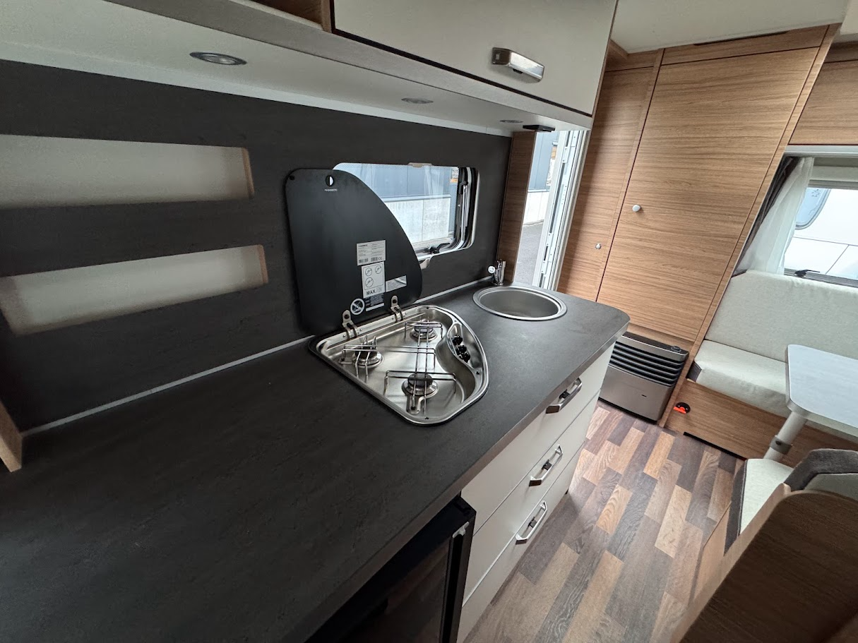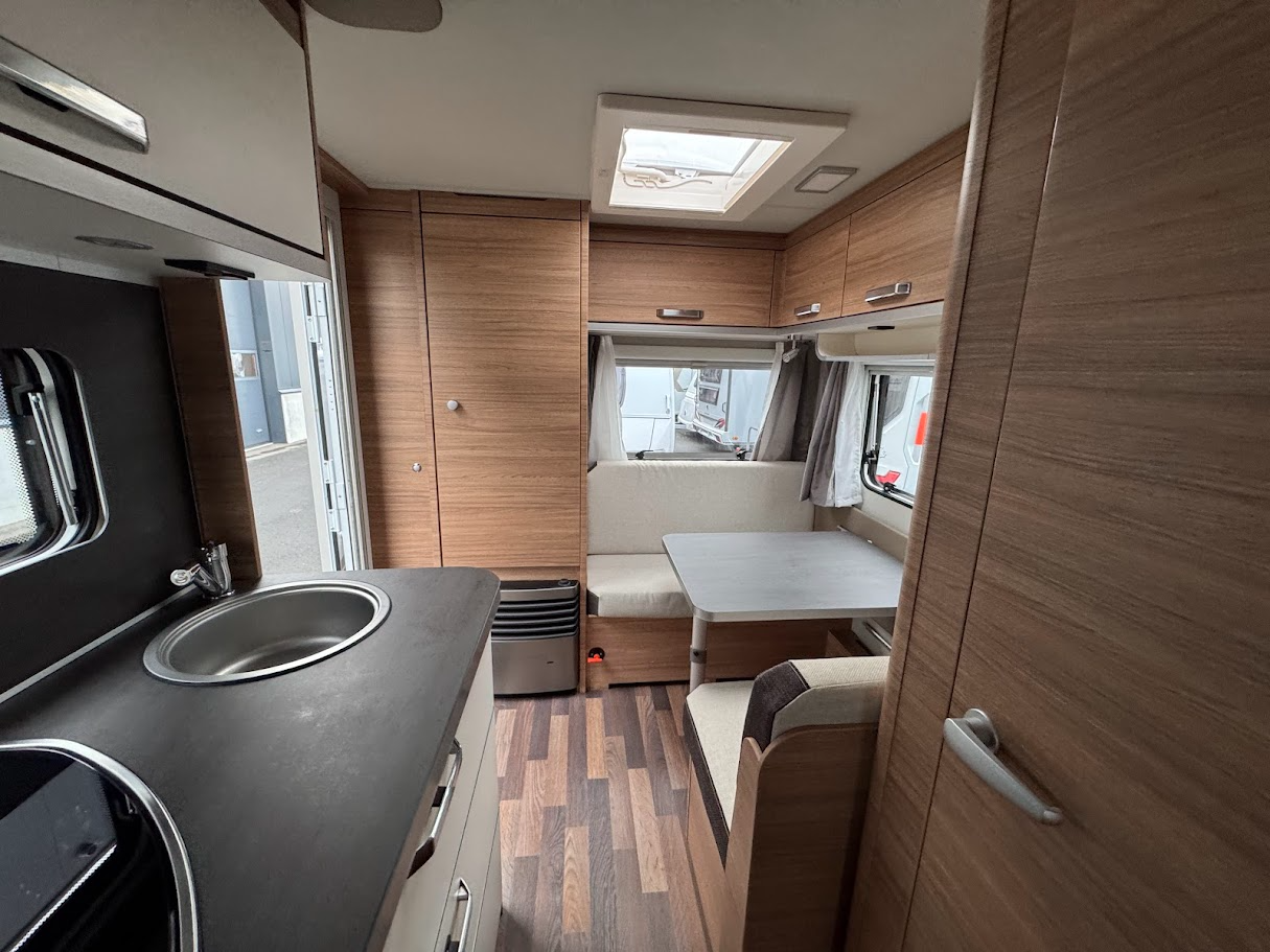 Aménagement : lit fixe, siège de train, salle de bain avec toilettes à cassette et lavabo, bloc cuisine spacieux avec réfrigérateur-congélateur, cuisinière avec 3 plaques de cuisson au gaz.